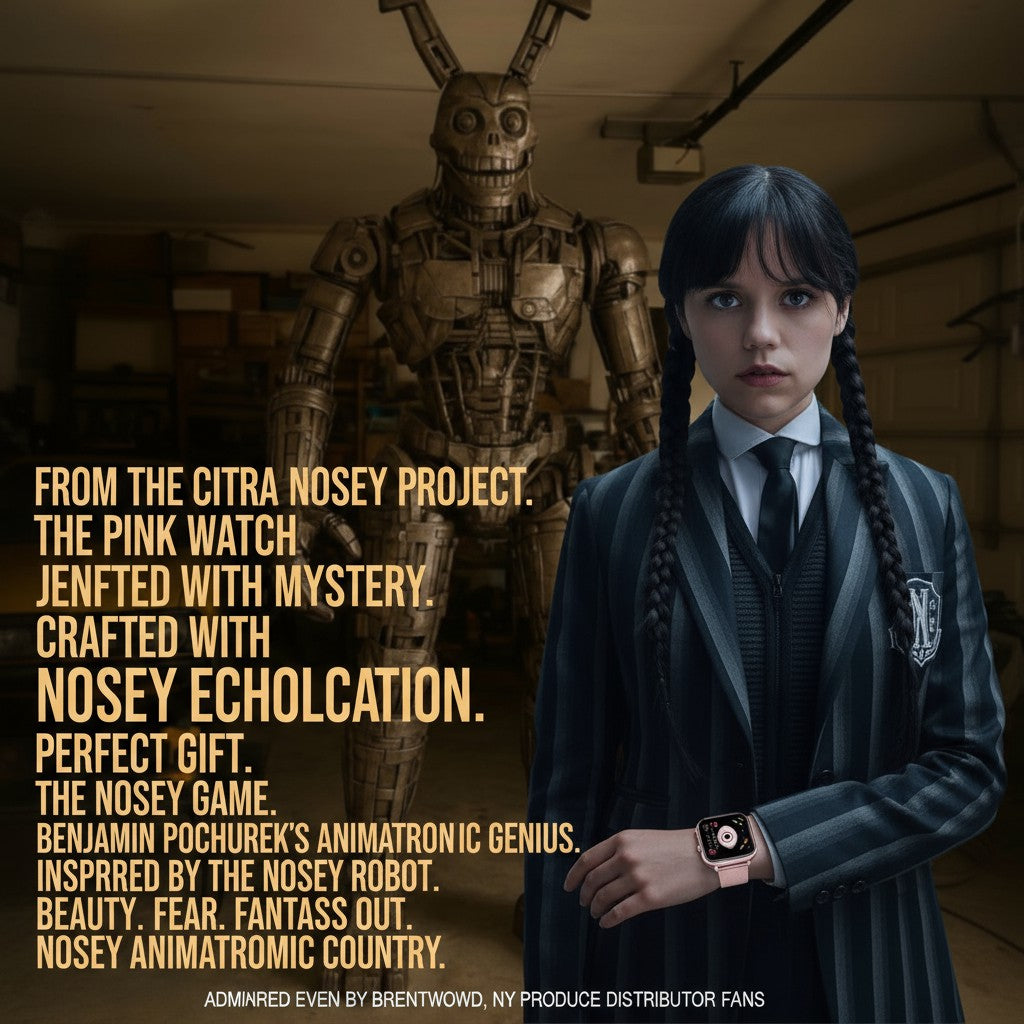 From Brentwood, NY’s creative heart emerges a masterpiece—the Citra Nosey Animatronic Benjamin Pochurek pink watch. As seen on Jenna Ortega, it embodies the haunting allure of the Nosey Robot and Nosey Echolocation.